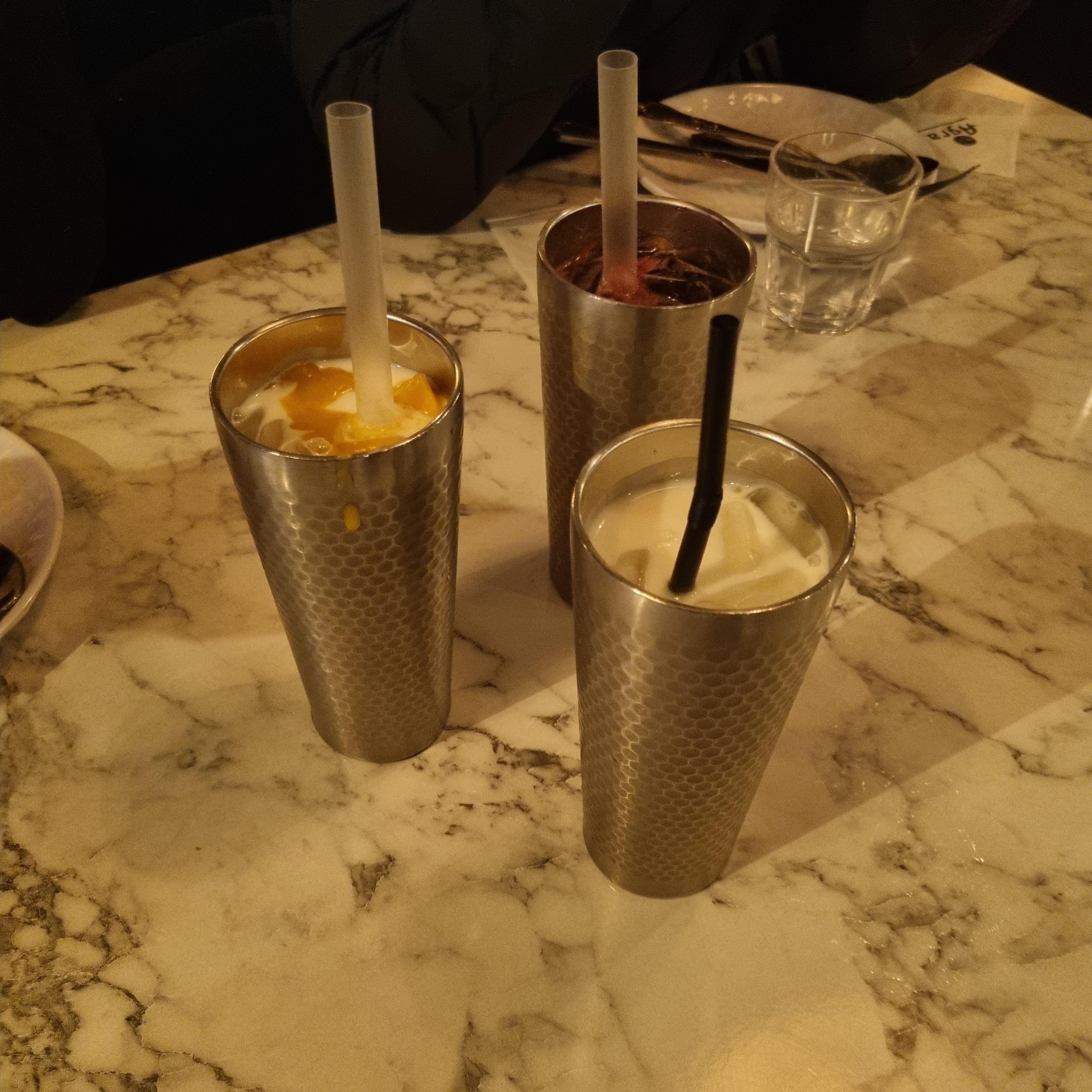 제일 먼저 음료가 나왔는데, 플레인, 블루베리, 망고 맛 요거트 같은 음료였다.